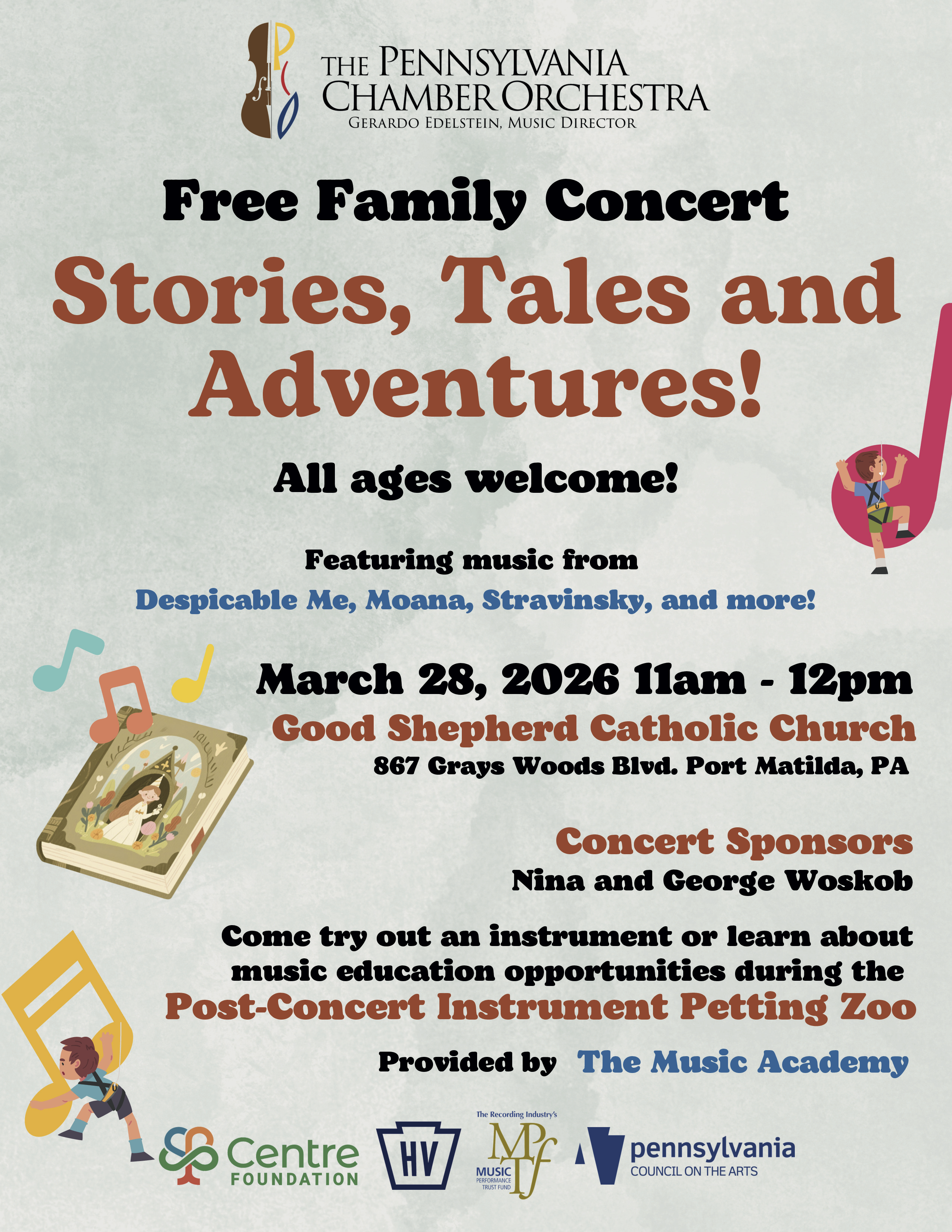 Pennsylvania Chamber Orchestra's free family concert, "Stories, Tales and Adventures!" will be held on Saturday, March 28 at 11:00 AM at Good Shepherd Catholic Church, 867 Grays Woods Blvd. Port Matilda, PA.